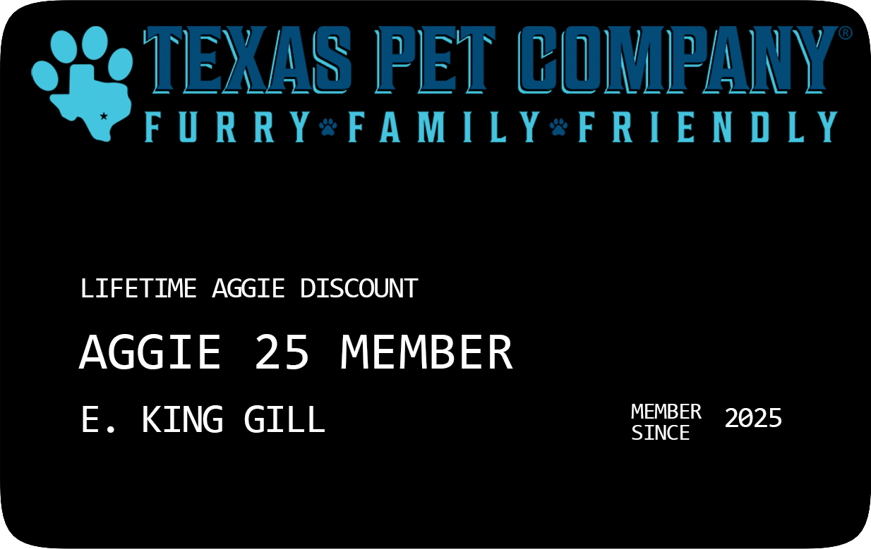 - Exclusive Aggie Lifetime 10% Discount on all purchases on TexasPetCompany.com
