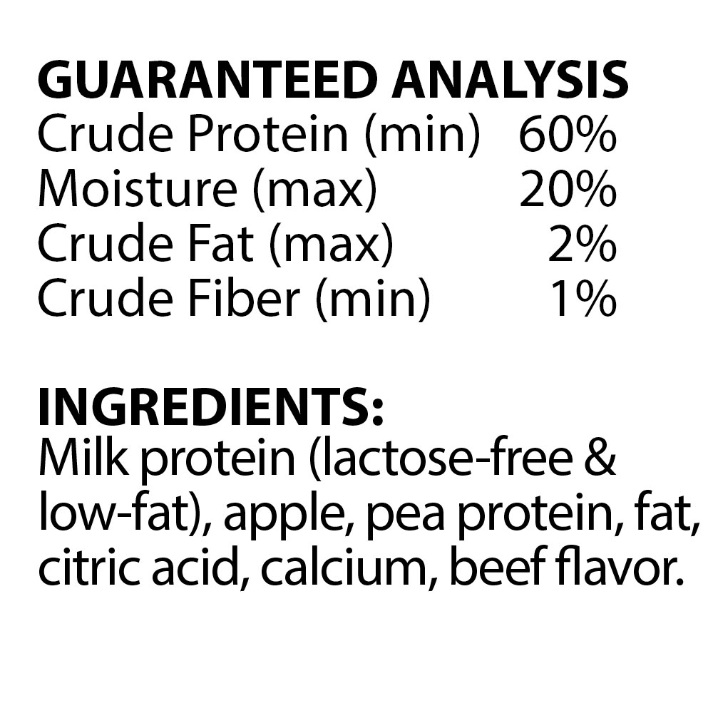 - Natural Ingredients: Casein Milk Protein, Apple Flour, Pea Protein, Pork Fat, Calcium, Citric Acid, Salt, Beef Flavor.