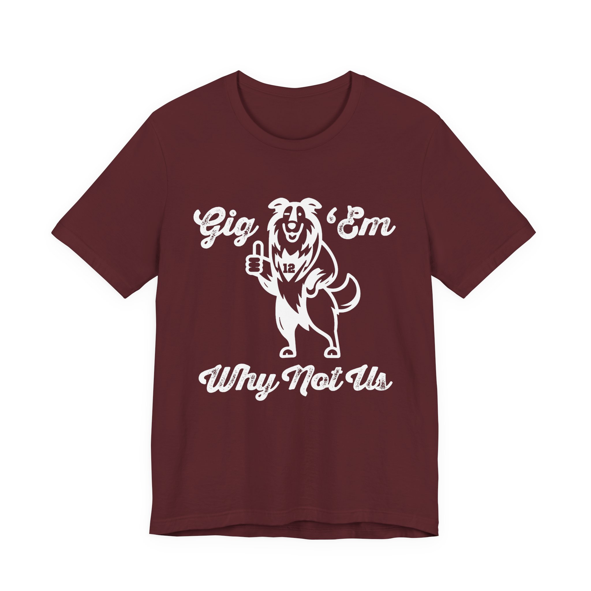 A soft, breathable tee built for everyday wear that carries a playful, team-first attitude. Lightweight Airlume cotton keeps you comfortable whether you’re out running errands, layering for a rehearsal, or cheering from the sidelines. The front artwork shows an energetic dog mascot mid-stride with the slogan “Gig & I’m / Why Not Us,” while bold block lettering on the back reads “IT IS US” — a design made to rally small crews, bandmates, and close-knit teams. Finished with a ribbed collar, shoulder tape, side seams for structure, and a tear-away label for comfort, this shirt balances street-ready style with dependable construction. Ethically produced and REACH certified, it’s a casual staple that feels like part of the crew from the first wear.