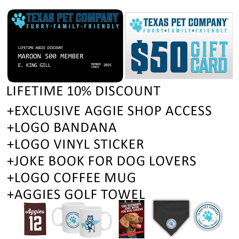 - Exclusive Aggie Lifetime 10% Discount on all purchases on TexasPetCompany.com