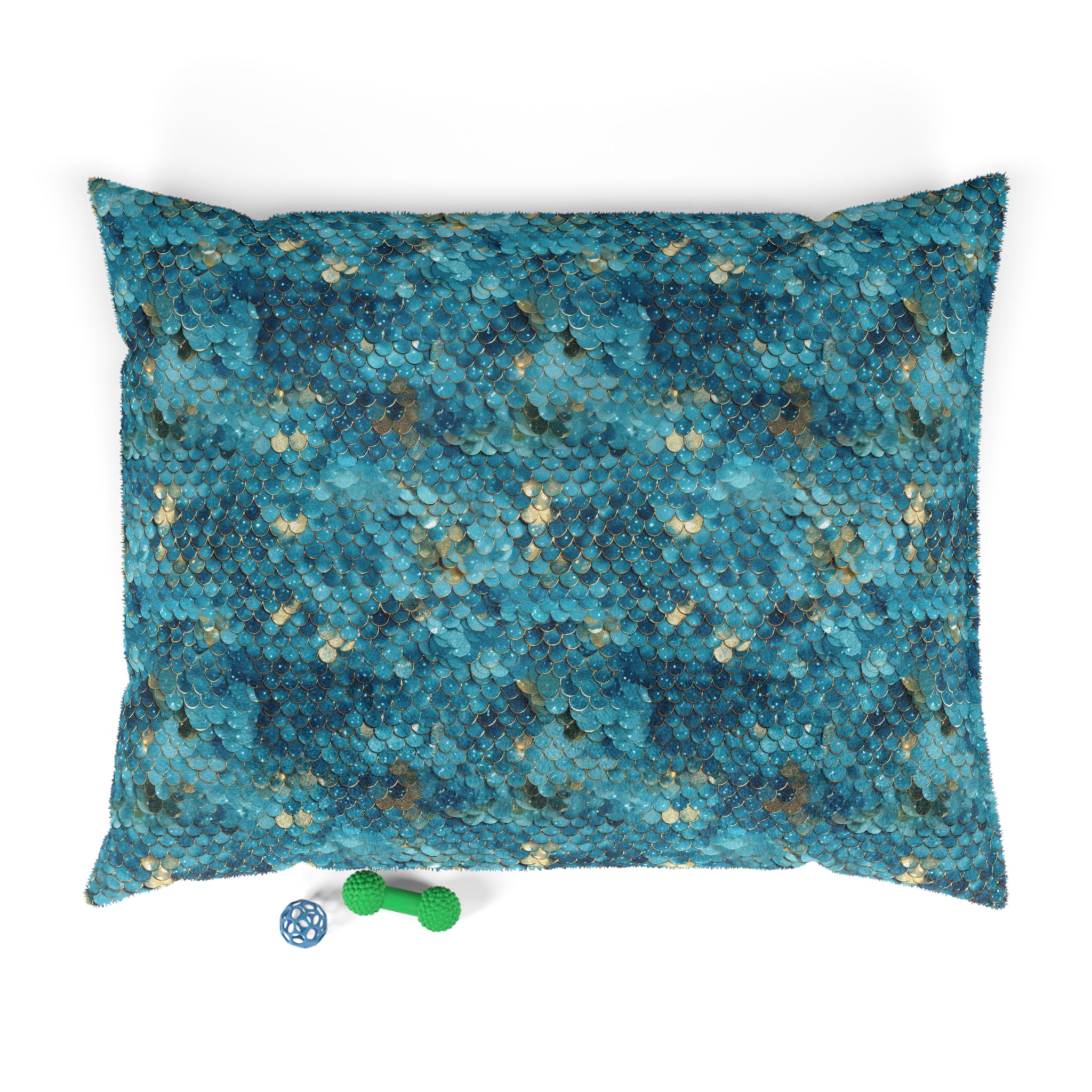 Give your four-legged family member an enchanting place to rest. Whether your dog is a retired K9, a seasoned hunting partner, the "roving home security system" of your property, or the spoiled and pampered beloved furry family member...Transform your pet's lounging experience with our enchanting Mermaid Scales Pattern Pet Bed! Featuring a stunning mermaid-inspired design with shimmering turquoise and gold scales, this premium pet bed combines comfort, style, and durability. Perfect for pet lovers who want to bring a touch of ocean magic to their home while giving their furry friend the cozy nest they deserve. Designed with a durable cotton duck underside and a plush fleece top, it’s the perfect indoor retreat for your furry family member.