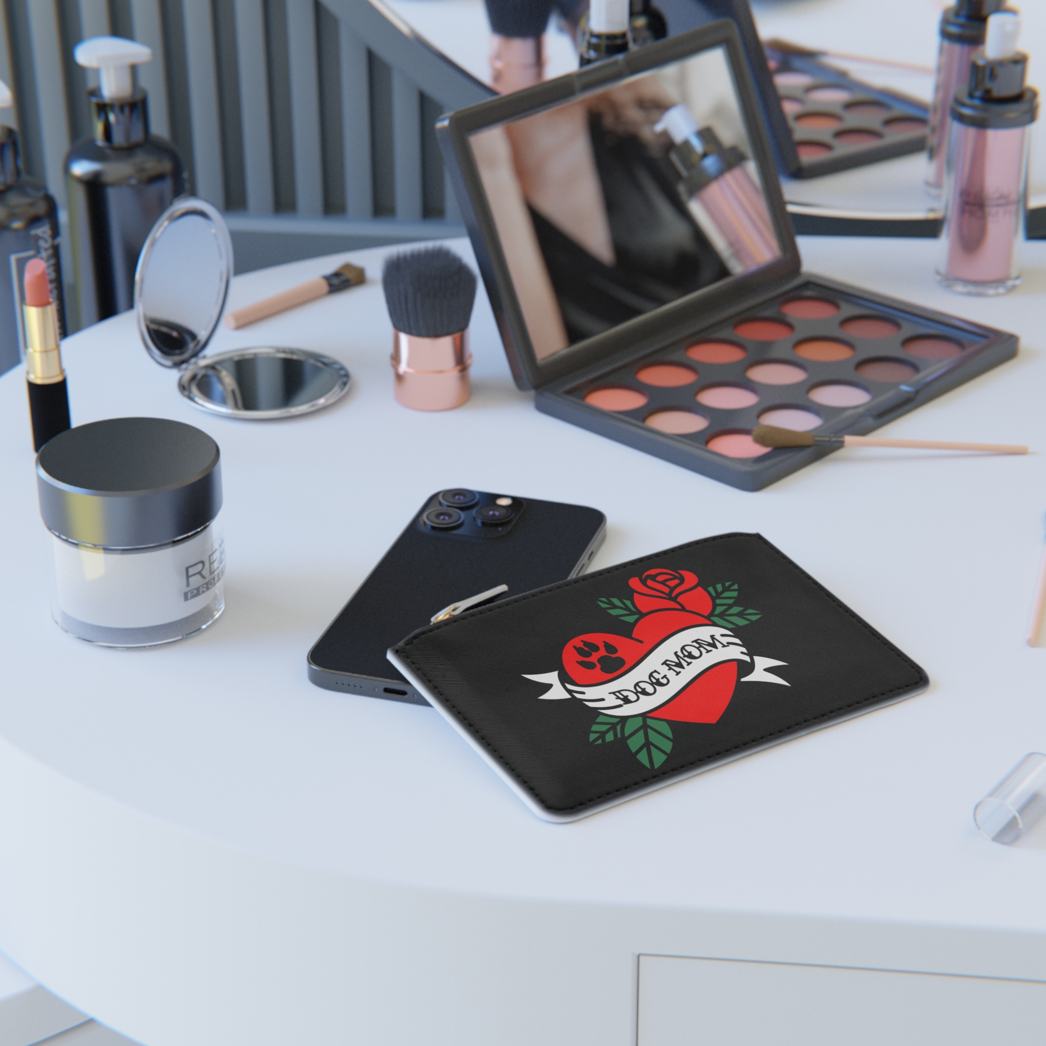 A compact, stylish mini clutch crafted for dog lovers who carry their essentials with heart. The black Saffiano-finish faux leather sets a sleek backdrop for the bold red heart, rose, and paw-print motif—an old-school tattoo-inspired design that reads “DOG MOM” on a wrapped banner. Inside, a single compartment and a handy pocket keep a cardholder, keys, and a few small items organized. Gold-tone metal zipper and white leatherette pull add a touch of polish while cruelty-free materials and vivid double-sided printing keep the look lively and ethical. Easy to tuck into a larger bag or carry solo on quick outings, this clutch feels personal and playful—made for everyday moments and small celebrations of the bond with your pup.