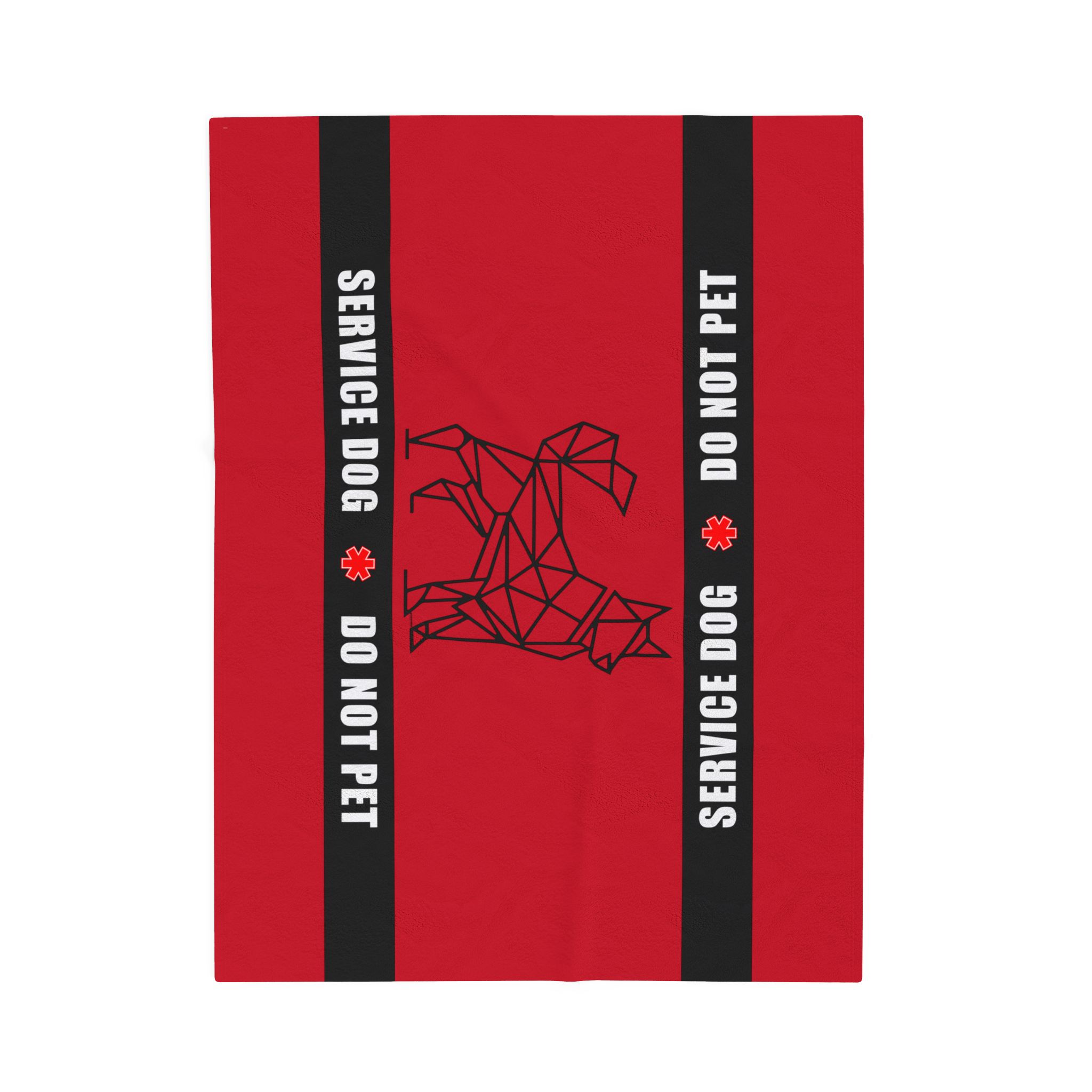 A plush velveteen blanket designed with calm and clarity in mind. The deep purple field and bold black stripes frame a geometric service dog outline, flanked by clear, compassionate text: “SERVICE DOG + DO NOT PET”.