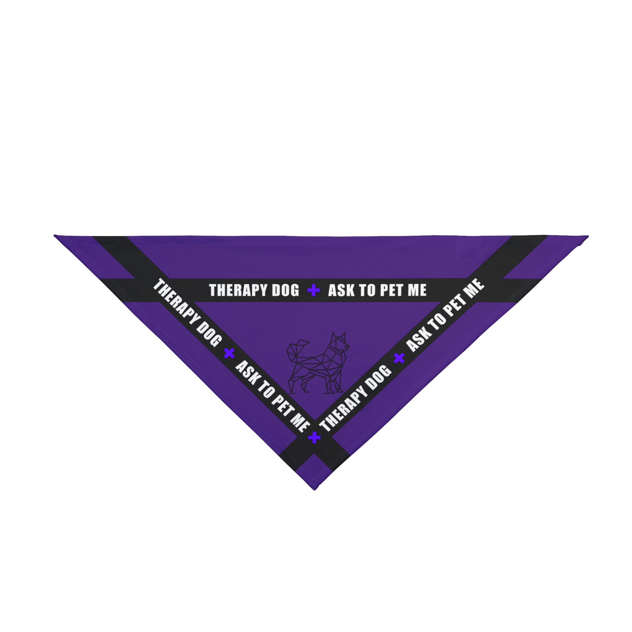 A soft, lightweight triangle bandana that speaks gently before your therapy dog does. Deep purple panels and clean black trim frame the bold white ribbon text — "THERAPY DOG • ASK TO PET ME" — so handlers can communicate comfort and boundaries without words. The single-sided, all-over print keeps the message clear from the front while the hemmed edges and sewn-in label add a finished, durable feel. It ties easily around collars or harnesses and comes in two sizes to suit small through large companions, bringing calm, clarity, and a touch of dignity to visits, clinics, schools, and community events.